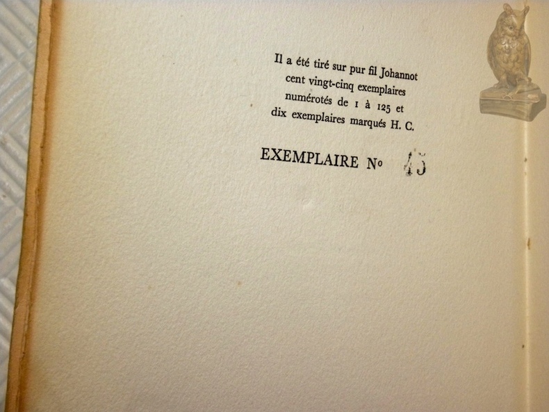 Paris, Corrêa 1953, 190x140mm, frontispice, 133pages, broché. Un des 125 exemplaires sur papier pur fil Johannot, numéroté n.° 45 / 125. Auréoles brune sur les pages de garde, autrement intérieur propre. Bel exemplaire.