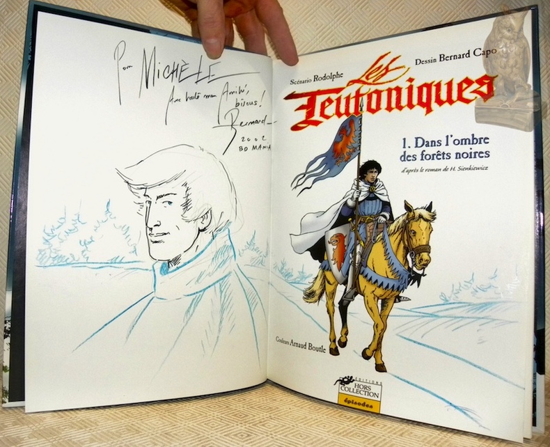 Sans lieu, Editions Hors Collection 2001, 300x225mm, 47pages, cartonnage illustré de l’éditeur. Dessins et dédicace de Bernard Capo au revers de la page de garde et sur la page de titre. Exemplaire à l'état de neuf.