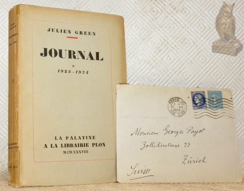 Paris, Librairie Plon 1938, 200x130mm, 299pages, broché. Dos insolé et petites déchirures sur le bas du dos. Intérieur propre. Un des 610 exemplaires sur papier alfa, numéroté n.° 465 / 550. Envoi de l’auteur sur le haut de la page de faux titre et avec une lettre manuscrite de Julien Green.