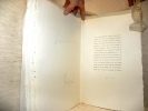 Lausanne, Françoise Simeneck Editeur 1975, 465x285mm, en feuilles sous couverture à rabats, étui toilé à rabats.Edition originale tirée à 120 exemplaires (dont 20 de tête avec suite) numérotés sur papier à la main du Moulin de Larroque, composés en Elzévir XVIIe corps 12, sur les presses de Fequet et Baudier à Paris pour les bois et la typographie et par l’Atelier de Saint-Prex pour les gravures, chaque livre est signé par l’auteur et l’artiste, numéro 26. Bel exemplaire.