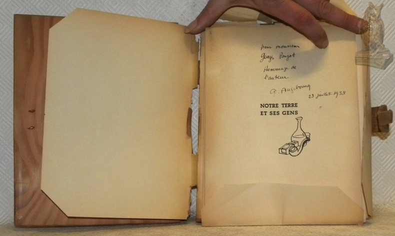 Lausanne, La Guilde du Livre 1937, 240x180mm, 23pages, en feuillles, couverture planchette en bois, avec fermoir en cuir, vignette de titre imprimée collée sur le plat supérieur, dédicace de Géa Augsbourg sur page de faux-titre en date du 23 juillet 1938. Tirage spécial numéroté sur papier Alfa bouffant anglais, n° 22.