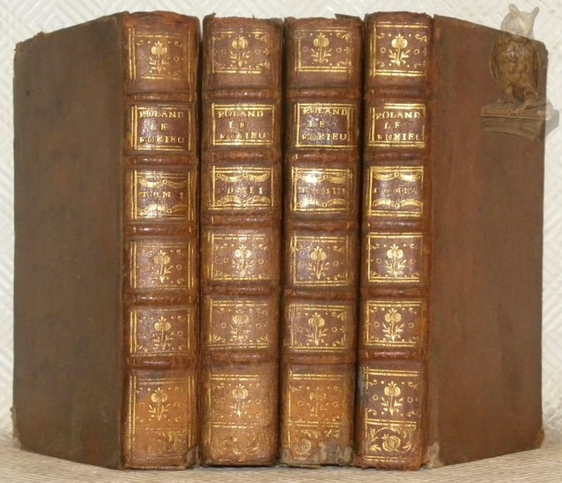 Paris, Aux dépens de la Compagnie 1756, 170x100mm, reliure basane. Reliure de l’époque plein veau moucheté avec titre, tomaison, encadrements, ornementations et felurons dorés au dosnà cinq nerfs, tranche et garde marbré. Coiffes rognées et coins usés. Plat du tome 3 frotté. Ex-libris : Manfred Gsteiger.