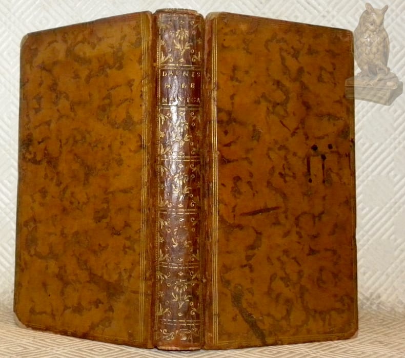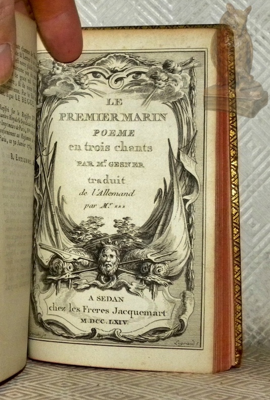 Paris - Sedan, Vincent et Freres Jacquemart 1764, 165x100mm, reliure de l’époque veau blond raciné avec pièce de titre et fleurons, ornementations, encadrements et filets dorés au dos, triple encadrements dorés au dorés sur les deux plats, bordure et dentelle intérieure dorées, tranches rouge, garde papier marbré. Ex-libris Manfred Gsteiger, autrement intérieur propre. Hormis coiffes émoussées et charnière supérieure un peu craquelée, bel exemplaire.
