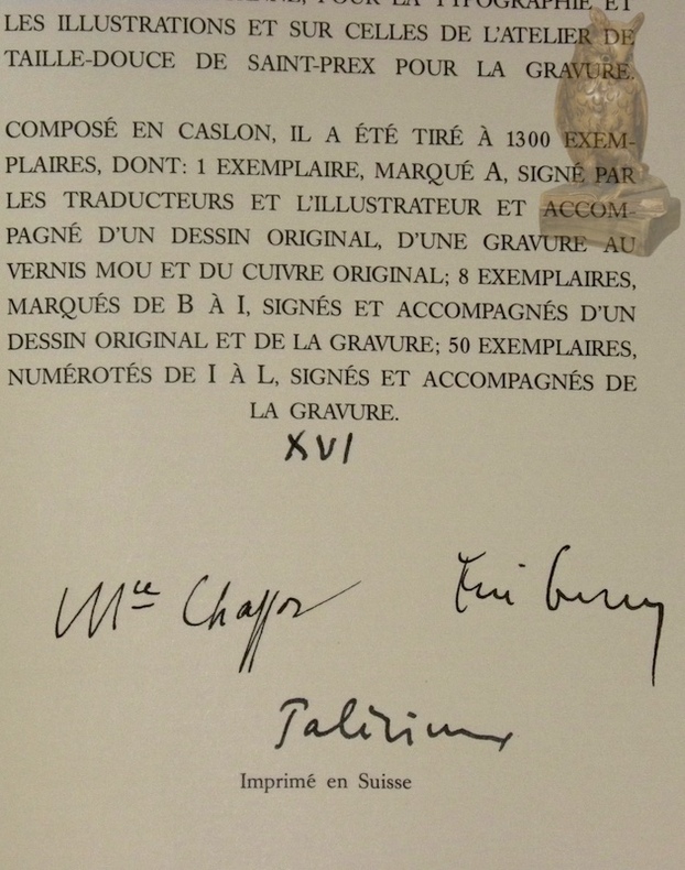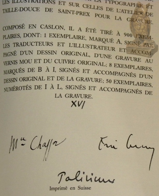 Albeuve, Editions Castella 1983, 215x150mm, 115 + 188pages, broché. Couverture à rabats. Sous emboitage. L'un des 50 exemplaires de luxe, signés par les traducteurs et l’illustrateur at accompagnés de la gravure, numéroté XVI / L. Etat neuf.