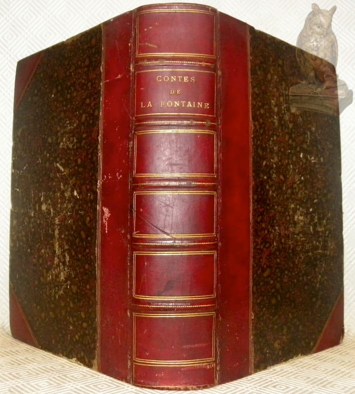 Paris Garnier 1877 1 in-4 demi-chagrin un volume, reliure demi-chagrin bleu-marine in-quarto (binding half shagreen in-quarto ), dos 5 nerfs (spine with 5 raised bands) - titre frappé or (gilt title) avec filets or, filet or en place des nerfs et en tête et en pied, entre nerfs à caissons dorés, ornés de fleurons dorés avec rinceaux dorés aux angles dans un encadrement de triple filets dorés, plats de percale bleu-marine decorée à froid à plaque spéciale editeur à triple filets à froid en encadrement, toutes tranches lisses, Edition illustrée de 180 vignettes in -texte en noir par Tony Johannot, C. Boulanger, Roqueplan, Fragonard Pere etc. et de nouveaux dessins hors texte par Staal, LII + 589 pages, [1880] Paris Garnier Frères Editeur,
