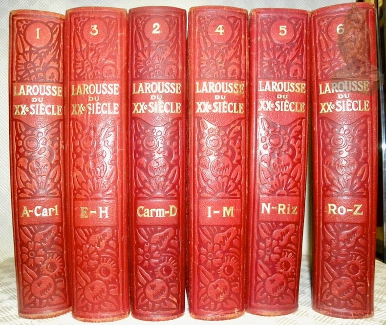 Paris, Librairie Larousse sans date, vers 1920, 325x245mm, reliure d'éditeur. Demi-chagrin vert, plats percaline vert, ornementations dorés et à froid sur le dos et les plats.Usures à certains coins, tome 3 dos insolé, autrement bon état.