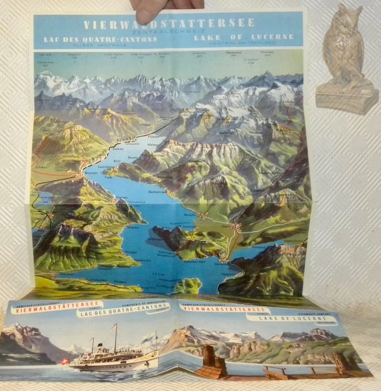 1956, 150x100mm, carte en couleurs sur une face et horaire, descriptions et photographie n/b sur l’autre face.