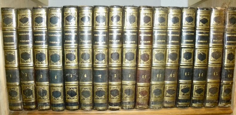 Paris - Petit-Montrouge, chez l’éditeur 1842-1843, 285x200mm, cartonnage papier marbré, pièce de titre rouge au dos, tranches non rognées. Tome 13 coiffe endomagée, autrement série en bon état dans l’ensemble.