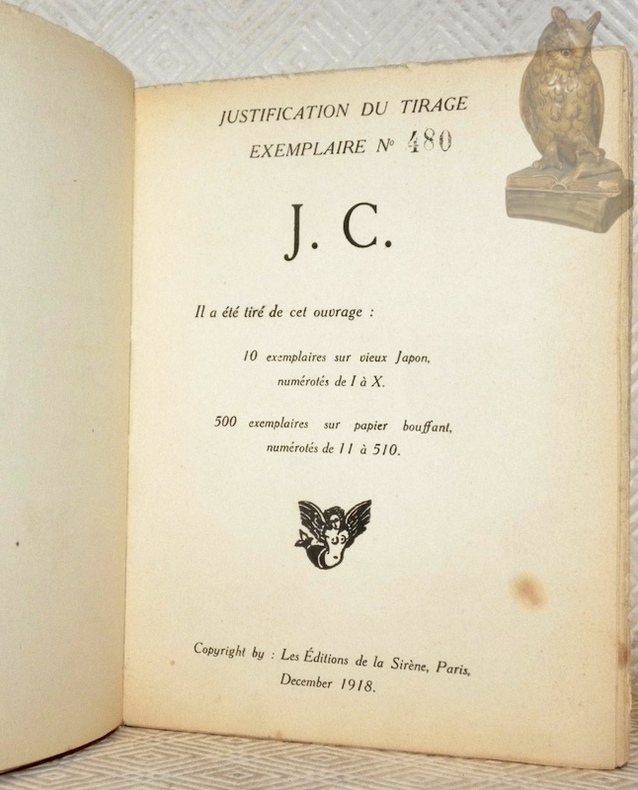 Paris, Editions de la Sirène 1924, 165x120mm, broché. Edition originale numéroté sur papier bouffant n° 480, exemplaire d’auteur avec les initiales J. C. Petite tache brune sur les premières pages autrement, très bon état. Bel exemplaire.