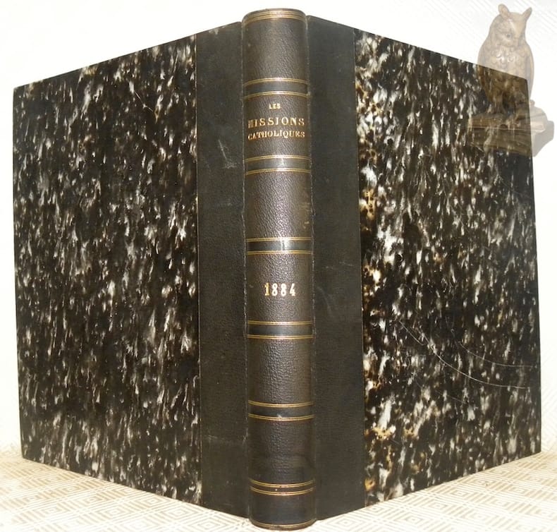 Lyon - Paris - Bruxelles, Bureaux des Missions Catholiques - Victor Lecoffre - Albanel 1884, 315x235mm, 641pages, reliure demi-chagrin. Titre, filets et année de parution dorés au dos. Plat papier marbré. Bel exemplaire, couvertures consevées à la fin de l’ouvrage. 9 Cartes et plans. 1. A travers le Zanguebar. 2. Carte du Lambaréné au Congo. 3. Excursion chez les Batékés (Deux Guinées). 4. Plan du Couvent de Saint-Antoine (Thébaïde). 5. L’Archipel des Comores. 6. Plan du Couvent de Saint-Paul (Thébaïde). 7. De Liang-Tschou (Kan-sou) à Kouldja. 8. VicariaT du Bénin et Préfecture du Niger. 9. Carte (dépliante) de la partie centrale de la Mission de la Sénégambie (du Kayor à la Gembie)