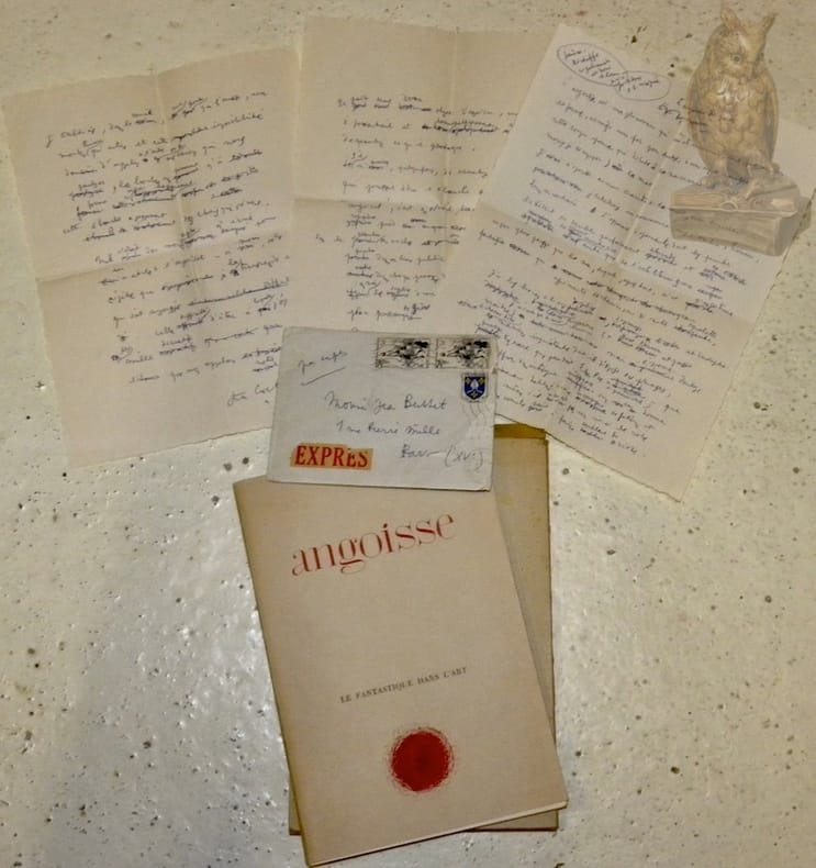 1957, 270x210mm, suit le manuscrit complet du texte, titré L’Angoisse des poètes. II fut commandé par l’auteur pour les Laboratoires Robert & Carrière qui venaient de lancer le “Decontractyl Phenobarbital”. La plaquette éditée à cette occasion (cf. n° ci-dessous) publiait pour la premiere fois ce petit texte de Cocteau. Jean Berthet fut couronné par plusieurs prix littéraires dont le prix Jean Cocteau en 1990. Il compose plus de deux cent mille vers qui firent l’objet d’une centaine de recueils, certains illustrés par Pleynet, Effel, et écrivit une cinquantaine de pièces. Robert Sabatier, dans sa monumentalo Histoire de la Poésie française, le classe résolument parmi les “fantaisistes”. Beau document. Joint :AngoisseLe Fantastique dans l’art.Paris, Publicat, 1958.1 vol. (245x165mm) en feuille, sous chemise imprimée en rouge et noir. Edition originale. Texte inédit de Jean Cocteau illustré de 3 dessins de l’auteur. Plaquette éditée pour les Services de Documentation des Laboratoires Robert & Carrière. Les XVI oeuvres reproduites à la suite du texte de Cocteau figuraient au catalogue d’une exposition Bosch, Goya et le fantastique.