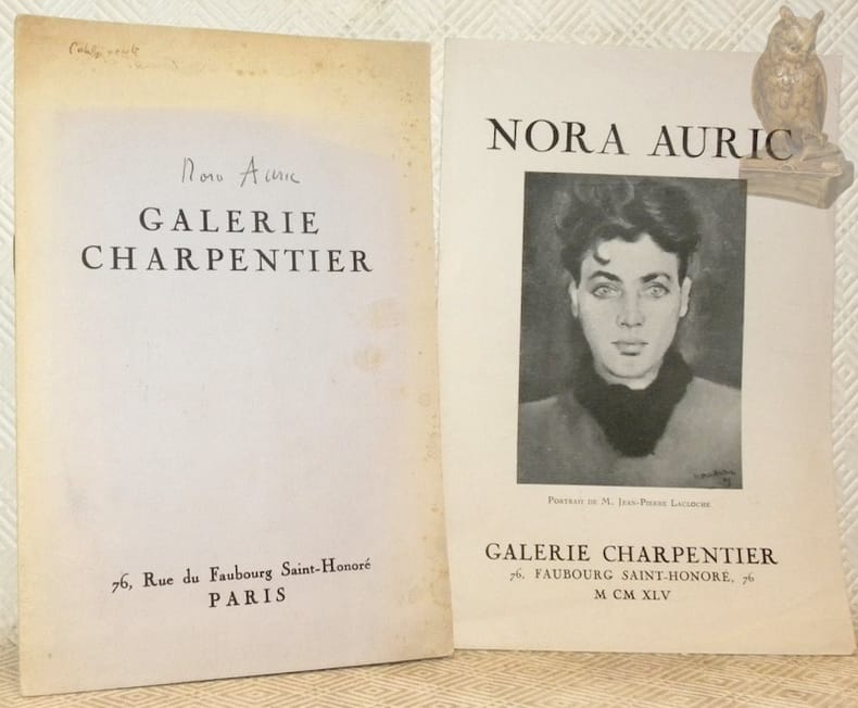 Paris, 1945, 240x160mm, Plaquette de 4 pages sous couverture typographique.Pour l’exposition de son amie Nora Auric, Cocteau écrit un quatrain rimé, que l’imprimeur reproduira avec des fautes qui sont corrigées par Cocteau au crayon papier, la Galerie fera réimprimer le catalogue suprimant la couverture, sans doute par mesure d’économie. L’exemplaire fautif et l’exemplaire réimprimé ensembles.