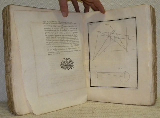 Paris, Imprimerie Royale 1767 270x210mm, 5 ff. (garde, titre, table des matières), 206 pages (Histoire de l’Académie Royale des Sciences), 1 ff. (errata), 579 pages (Mémoires), illustré de 16 planches gravées sur cuivre, dépliantes, broché papier muet, tranches non rognées, grandes marges, étiquette au bas du dos.Mémoires de: Buache - Le Monnier - Haller - D’Alembert - Du Séjour - Tillet - Morand - Bondaroy - Pingré - Bailly - De Luynes - Bézout - Cassini - Chappe d’Auteroche - Tenon - Abbé Nollet - Deparcieux - Guettard - La Lande - Montet.