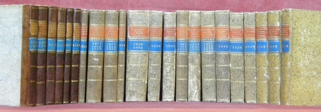 185x110mm, 220x135mm, 6 premiers volumes reliés demi veau à coins, étiquette de titre rouge, étiquette de l’année bleue, les autres volumes sont cartonnés papier moucheté, étiquette de titre rouge, étiquette de l’année bleue, tranches rouges, reliures de l’époque, belle série.