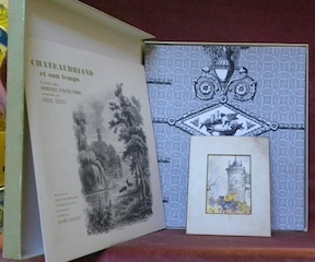 Editions du Crédit Lyonnais 1964 1 vol. relié grand in-4, reliure en tissu de l'éditeur, emboîtage de l'éditeur, 146 pp., reproductions en noir et en couleurs. Un des exemplaires nominatifs, celui-ci imprimé spécialement pour Pierre Clarac qui a signé la préface. Bien complet du disque 33 tours offrant des extraits des Mémoires interprétés par Pierre Fresnay et la romance "Combien j'ai douce souvenance" chantée par Suzanne Vayssaire. Exemplaire truffé d'un portrait gravé de Chateaubriand. En très bonne condition.