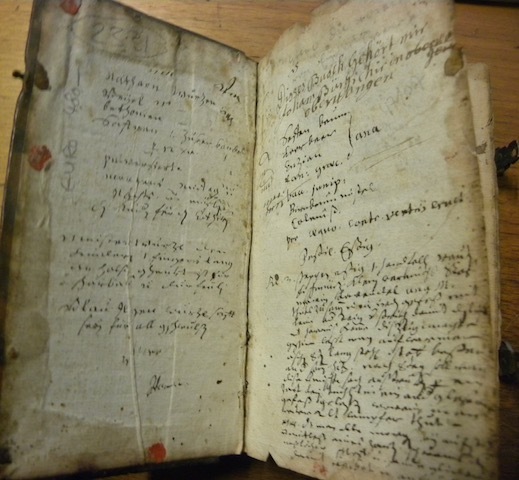 Büdingen, Joh. Friedr. Regelein 1721, 170x95mm, 161Seiten, Einband aus Kalbsleder aus der Entstehungszeit, gerippter Buchrücken, erhaltene Messingverschlüsse, alte Beschriftungen auf den Buchdeckeln und dem Vorsatzblatt, stellenweise Wurmlöcher.