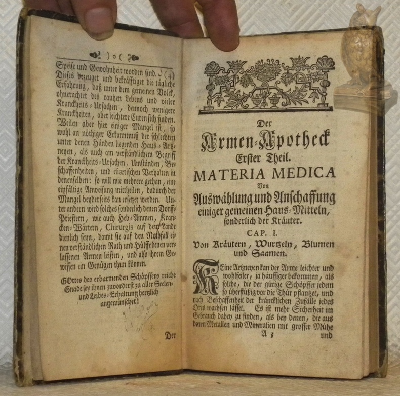 Büdingen, Joh. Christoch Stöhr 1748, 170x95mm, 250Seiten, Basil-Halbledereinband. Goldgeprägten Rückentitel (XIXe). Ende des Buch: Wahrhafte Schatzkammer von bewährten Hausmitteln. O.J. (ca. 1850), 23 S.