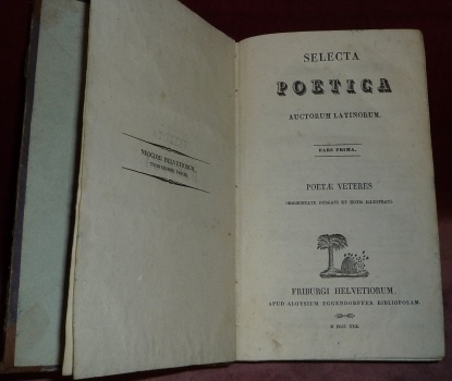 Friburgi Helvetiorum, Apud Aloysium Eggendorffer Bibliopolam 1830, 205x120mm, 502pages, reliure demi-basane. reliure demi-basane. Plats cartonnés. Dos muet. Ex libris de “Wuilleret de la Rochette” sur la première page de garde. Intérieur propre. Bon état de cette édition modeste rassemblant des poèmes de Properce, Catulle, Ovide, Juvénal, etc.