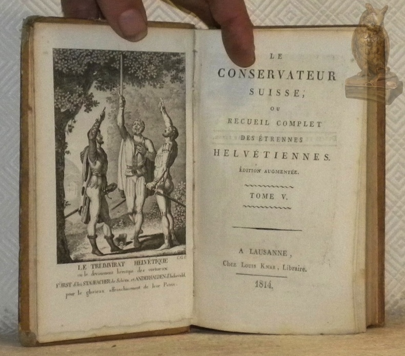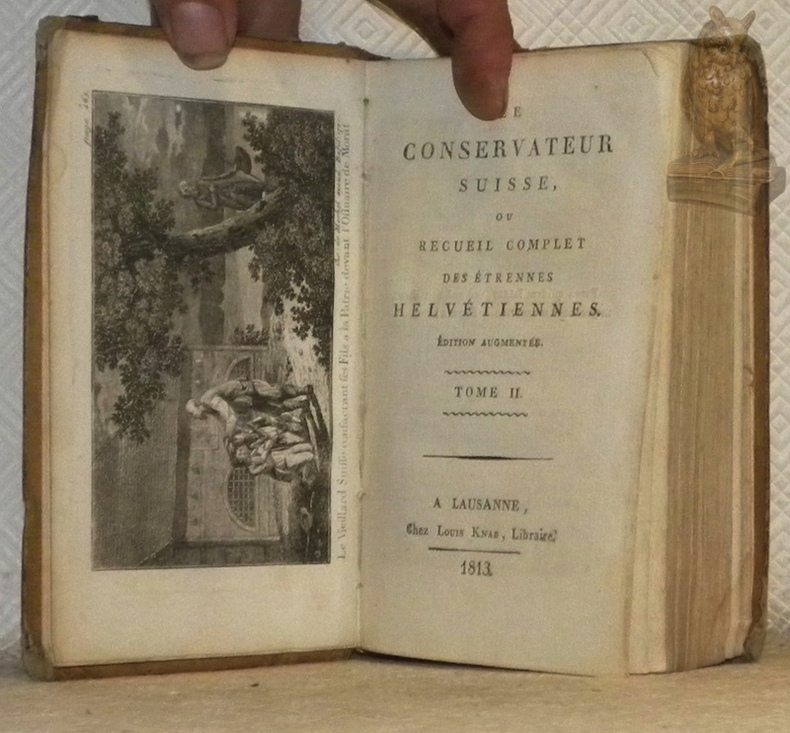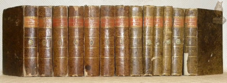 Lausanne, Louis Knab et Au Dépôt Bibliographique de Benjamin Cornaz Libraire 1813 - 1831, 175x105mm, cartonnage papier marbré de l’époque, pièce de titre et de tomaison, filets dorés, papier marbré par endroits déchirés. Coins supérieurs du tome 9 abimés.