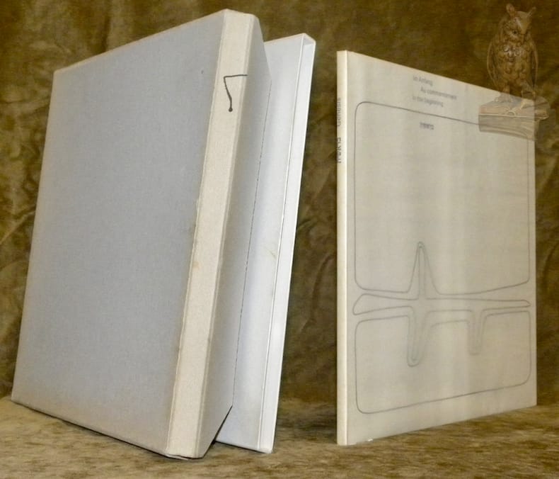 Albeuve et Zurich, Castella et Flamberg 1969, 255x260mm, 11pages, illustration n/b + 5 pages doubles avec une illustrations en couleurs, broché, dans cartonnage. Cette édition comporte deux sorte de dessins conçus pour se répondre. Sur les pages intérieures des compositions linéaires illustrent le texte dans un sens figuratif. Sur les pages extérieures rabattzes, des formes symboliques projettent leur lumière dams des surfaces bleues. En feuilletant ce livre La Genèse (I, 1-2 4) il convient de laisser les rabats ouverts. Sous emboitage et avec le cartonnage d’envoi. Exemplaire à l'état de neuf.