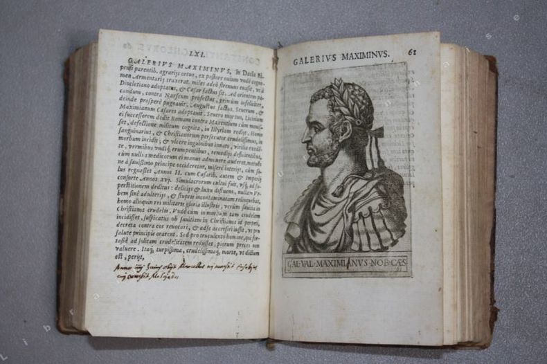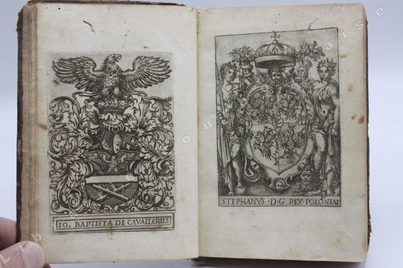 Rome, Apud Vincentium Accoltum, 1583 ; petit in-8 ( 17 x 12 cm). Titre gravé-4ff.-1f. bl.-1f. blason de l'artiste.-1f. armoiries de Stéphane roi de Pologne.-152 ff. de portraits (chiffrés 157, avec quelques erreurs de foliotage et 5 feuillets comptant pour deux portraits : 87-88, 98-99, 100-101, 116-117. Le folio 22 est manquant). Reliure usagée en basane brune, dos manquant, plats frottés avec des manques, ex-libris manuscrit biffé sur le titre, bas du feuillet découpé sans atteinte à la gravure, des rousseurs et quelques trous de vers. Nombreuses annotations manuscrites anciennes.