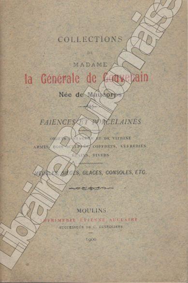 Catalogue de la vente des objets collectionés par Madame de Gouvenain (Edmée Antoinette Gabrielle Hilarine de Moncorps de Chéry, 1808-1894), préparé par Francis Pérot, expert à Moulins, et sous le ministère de Me Depoid. La vente s'est tenue au domicile de la défunte, rue des Oderberts à Avallon, le 2 avril 1900 et les jours suivants. Mlle de Moncorps avait épousé en 1825 Charles-Ambroise de Gopuvenain (1793-1884), issus de Saint-Cyr en 1812 et nommé Général de brigade en 1848. "Madame la générale de Gouvenain a collectionné durant toute son existence, n'ayant de préférence ni pour un genre ni pour une époque, de là cette grande variété dans cette collection. Nous ferons tout particulièrement remarquer, les deux bustes signés, en porcelaine de Sèvres, de Louis XVI et de Marie-Antoinette, une grande potiche du Japon... une grande tapisserie de Felletin, ... parmi les meubles le beau régulateur de Boulle de la belle époque Louis XIV....". Le catalogue réunit 512 numéros.