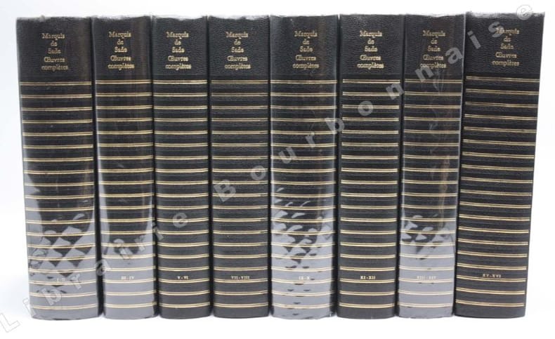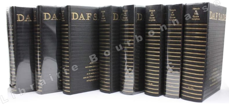 Edition établie par Gilbert LELY, qui signe la "Vie du Marquis de Sade , avec un examen de ses ouvrages". Une postface par Yves Bonnefoy, des préfaces et postfaces par : A. Hesnard, Maurice Heine, Pierre Klossowski, Jacques Lacan, Jean Fabre, Maurice Blanchot, Georges Bataille, Pierre Naville, Camille Schuwer, Gaëtan Picon, Gilbert Lely, Henri Pastoureau, Jean Gillibert, Antoine Adam, Jean-Jacques Brocher, Georges Daumas. Le dernier tome contient le "Voyage d'Italie précédé des premières uvres" et des "Opuscules sur le théâtre", publiés pour la première fois sur les manuscrits inédits, par G. Lely & G. Daumas.