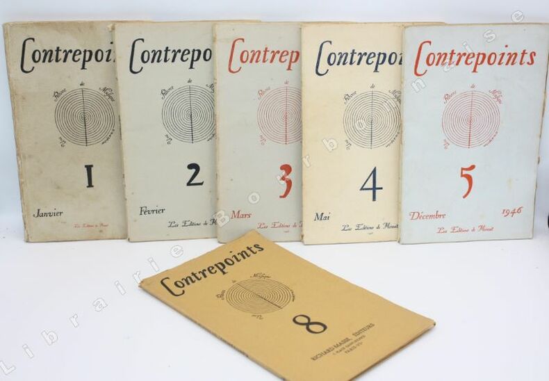 On joint le N° 8 de Contrepoints, paru sans date aux éditions Richard-Masse. Il semble que c'est le dernier numéro paru en 1953 ! "Bien que la [revue] ait eu une existence éphémère, les compétences exceptionnelles de ses contributeurs et la grande variété des sujets traités en font une source indispensable pour les musicologues et les chercheurs en musique.Le rédacteur en chef était le critique et musicologue Fred Goldbeck, conseiller musical à la Radiotélévision française. Le comité de rédaction était composé d'un groupe impressionnant de rédacteurs : Charles Koechlin, Henry Barraud, Henri Martelli et Roland-Manuel, ainsi que l'ethnomusicologue André Schaeffner et la pianiste virtuose et pédagogue Yvonne Lefébure. Marc Pincherle, musicologue et collectionneur de manuscrits musicaux, a rejoint plus tard ce groupe remarquable. Outre les membres du comité de rédaction, on compte parmi les contributeurs des compositeurs représentant un large éventail de courants compositionnels : Olivier Messiaen, Pierre Boulez, Virgil Thomson et John Cage". (Doris PYEE, Retrospective Index to Music Periodicals (17601966). RIPM.org 2017).
