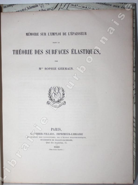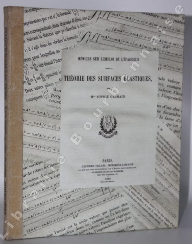 Sophie Gernain (1776-1831) fut sans doute la plus célèbre des mathématiciennes françaises de son époque. Ce Mémoire est extrait du Journal de mathématiques pures et appliquées, 3e série, tome VI, 1880. Edition originale posthume ; le texte avait été composé en 1824 et complétait ses "Recherches sur la théorie des surfaces élastiques" publiées à Paris, Vve Coursier en 1821. Il est accompagné de la transcription de divers courriers échangés entre la mathématicienne et Joseph Fourier et autres diverses pièces. Le manuscrit qui était conservé dans les papiers du mathématicien Prony déposés aux Archives de l'École des Ponts et Chaussées, a seulement été retrouvé en 1879. Il apparaît qu'il n'avait été lu que d'un autre mathématicien Denis Poisson.
