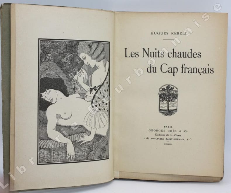 Édition originale du dernier et du plus célèbre ouvrage d'Hugues Rebell. Exemplaire sur Japon. Cet exemplaire est un des sept imprimés sur Japon impérial après trois sur Chine. La réalisation des Nuits chaudes du Cap français fut laborieuse. Lorsque son éditeur, Karl Boès, fit l’annonce de sa publication, une autre maison d’édition (Maison d’art de Paul Derniot et Paul Redonnel) fit savoir que les droits du livre leur avaient été vendus et ils menacèrent d’intenter un procès. L’auteur fit appel à un usurier pour les dédommager… Le livre, qui abordait des thèmes osés tels que l’homosexualité féminine, la flagellation et les rapports sexuels avec des mineurs ou des femmes noires, ne reçut que très peu de critiques littéraires et ne se vendit pas bien. L’ouvrage parut à un mauvais moment. Les lecteurs étaient en vacances, les critiques aussi, la Bibliographie de France elle-même ne le mentionne pas, n’ayant pas été avisée de sa publication… À la rentrée, les faiseurs de comptes-rendus étaient débordés par les nouveautés. L'ouvrage obtint le prix Nocturne en 1966. Exemplaire contenant deux lettres manuscrites de l'auteur, dont une d'engagement envers son éditeur Boès. Hugues Rebell, qui à juste titre comptait sur un grand succès de vente qui l’eût tiré d’embarras, s’en prit à Boès qui n’avait pas fait de service de presse, ni de publicité, et mal présenté son roman. Cet exemplaire contient une lettre de Rebell à son éditeur Boès dans laquelle il s'engage à lui donner son prochain roman L’Orgie Noire fin janvier. Mais leurs relations achevèrent de se dégrader. Boès refusa de publier L’Orgie Noire, la suite des Nuits Chaudes, ce qui causa un tort considérable à l’auteur. Hugues Rebell, harcelé par ses créanciers, fut ruiné. L’Orgie noire ne fut jamais publiée pas plus que les deux plaquettes. Pour fuir les huissiers, il quitta son appartement du boulevard des Batignolles pour un immeuble sordide du 10 rue des Francs-Bourgeois. Il parvint à sauver une partie importante de sa bibliothèque de grande valeur dont il refusa jusqu'à la fin de se séparer. Il ne sortit plus guère que la nuit, dans la crainte où il était d’être reconnu. Il mourut d'une péritonite en 1905, âgé de 38 ans. Cet exemplaire contient aussi un billet de Rebell adressé à son autre éditeur Léon Deschamps. Il lui demande la faveur d'assister à une représentation qui aura lieue le lendemain. Léon Deschamps (Sauzé-Vaussais, 1863-Paris, 1899) fut le fondateur de la revue littéraire La Plume et de la maison d'édition la Bibliothèque artistique et littéraire. Celle-ci publia, outre Rebell, Paul Verlaine, Jean Moréas, Laurent Tailhade et bien d'autres. À la suite de son décès le 28 décembre 1899, le conseil d'administration de la société anonyme La Plume nomma Karl Boès en avril 1900 pour lui succéder officiellement à la tête de la revue et de l'entreprise. Précieux exemplaire sur Japon, enrichi.