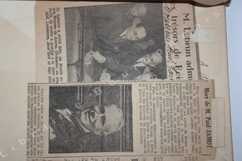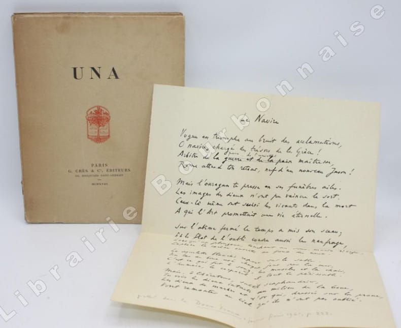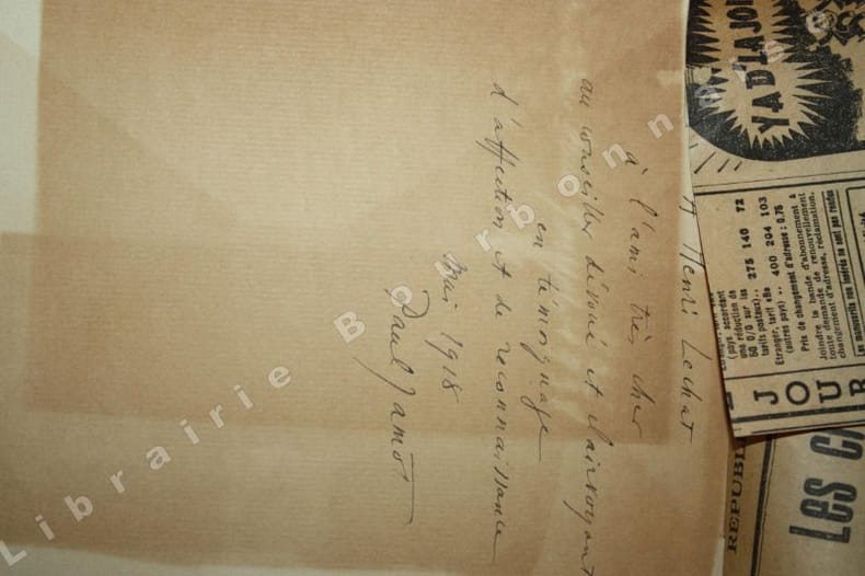 Edition originale tirée à 250 exemplaires sur vergé d'Arches, celui-ci N° 3 dédicacé à Henri Lechat, "à l'ami très cher, au conseiller dévoué et clairvoyant, en témoignage d'affection et de reconnaissance. Mai 1918". Accompagné de deux coupures de presse sur la première garde, et d'un poème en vers manuscrit de Paul Jamot (intitulé "Le Navire", publié dans La Douce France, janvier-février 1921, p. 223). Il a laissé un important héritage intellectuel en tant que conservateur (au Louvre et à Reims), archéologue, collectionneur, critique dart et peintre. Henri Lechat était également archéologue, conservateur de Musée, et comme Jamot, membre de la Société française d'Archéologie d'Athènes ; il publia plusieurs ouvrages sur la sculpture grecques. Sont joints deux autres poèmes imprmés extraits de revues.
