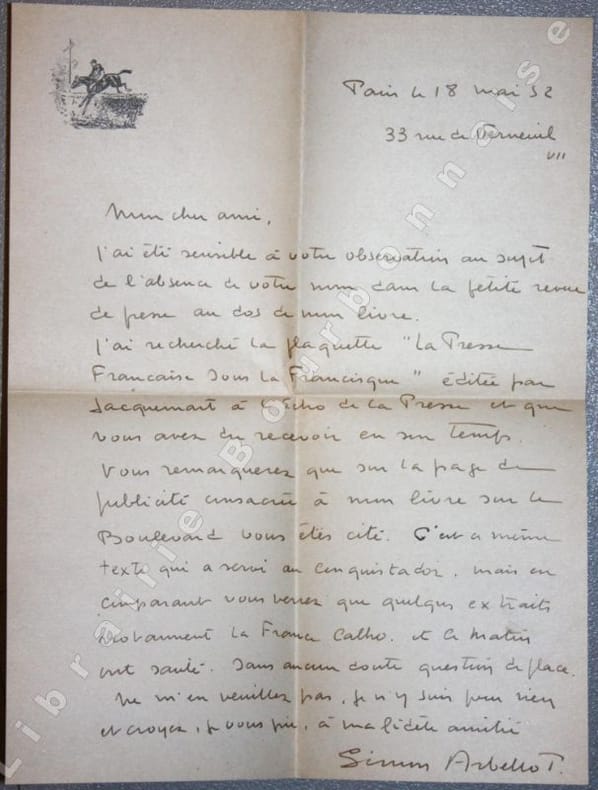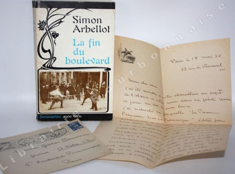 Edition originale, mention de 5e mille. Exemplaire de la Bibliothèque du journaliste Gaétan Sanvoisin qui légua sa collection à la Ville de Moulins (qui se défit d'une partie de celle-ci). On joint une lettre autographe de l'auteur adressée à Sanvoisin, Paris 18 mai 1952, dans laquelle il évoque un de ses ouvrages sur le même sujet : "J'ai vu mourir le boulevard", paru en 1950.Simon Arbellot de Vacqueur était originaire de Limoges et fit dabord carrière de journaliste au "Figaro" puis au "Temps". Proche des milieux de l'Action française et de Maurras (auquel il consacra un livre) il devint directeur de la Presse au ministère de l'Information du gouvernement à Vichy de 1940 à 1942. Ph. Pétain le nomma ensuite consul général de France à Malaga de 1943 à 1944. Il a raconté ses souvenirs dans "Eau de vichy, vin de malaga" (1952). "La fin du boulevard" décrit la vie intellectuelle et artistique à Paris, les théâtres, les cafés, le monde littéraire et celui du journalisme... au tournant de 1900.