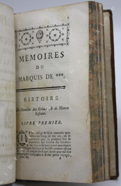 Charmante édition du premier roman de l'auteur, publié ici avec sa suite "l'histoire du Chevalier des Grieux..." bien complète en 2 volumes, qui s'ajoutent aux 6 précédents. "Cette brève histoire d'amour, à bien des égards scandaleuse, publiée anonymement en Hollande et condamnée au feu en France, s'est imposée bientôt comme l'un de nos plus purs récits. Elle a connu, du vivant de Prévost, 23 éditions et au total, jusqu'à aujourd'hui, 250 éditions, ce qui en fait sans doute, avec les Aventures de Télémaque, le roman le plus constamment réédité de notre littérature". (Jean Sigard, "En français dans le texte", 144)