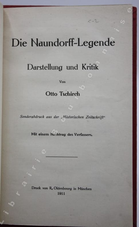 München, R. Oldenbourg, 1911 ; in-8. 72 pp. Pleine toile rouge, pièce de titre rouge en long. De la bibliothèque Naundorf : supra-ex-lbris doré sur le premier plat "Prince René Louis-Charles de Bourbon (Naundorf)".