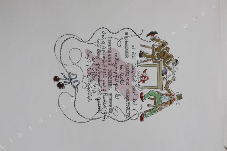 Edition tirée à 1000 exemplaires, un des 900 sur vélin, illustrée de très nombreux dessins in-texte en couleurs par Maurice Varvasaux. Il est précisé à la fin de l'ouvrage que celui-ci a été calligraphié par Michel Kieffer et illustré par Maurice Varsavaux alors qu'ils étaient l'un et l'autre prisonniers de guerre à l'Oflag VIA en Westphalie. Kieffer était le fils de l'éditeur-relieur René ; il pratiquait la reliure et avait rejoint l'atelier de son père en 1936 ; il lui succéda à la tête de la librairie en 1958. Varsavaux publia à petit nombre un livre de souvenirs de ses années de prisonnier de guerre également illustrée dans la même veine : "Kriegsgefangener Nr. 4482".