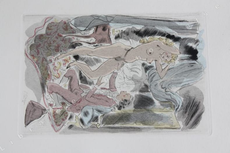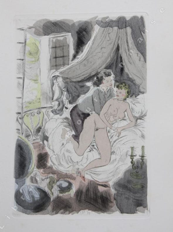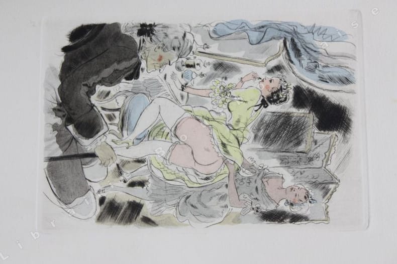 Paris, Editions Vialetay, "Le Panorama des Moeurs", 1952 ; in-8 en feuilles sous chemise et étui d'éditeur. 141 pp.-4 ff. 12 eaux-fortes rehaussées en couleurs à pleine page par Raoul SERRES sous le pseudonyme de SCHEM. Très légères et éparses rousseurs. Bon état.