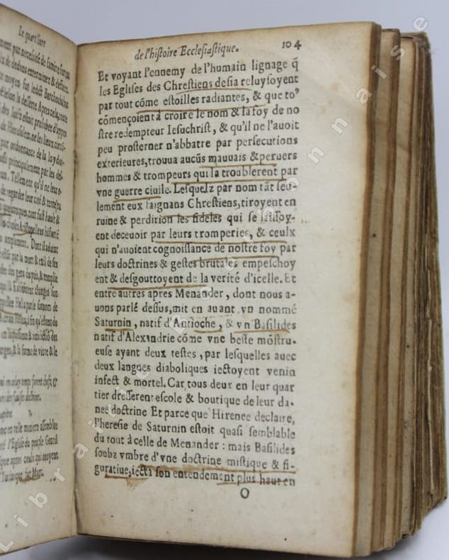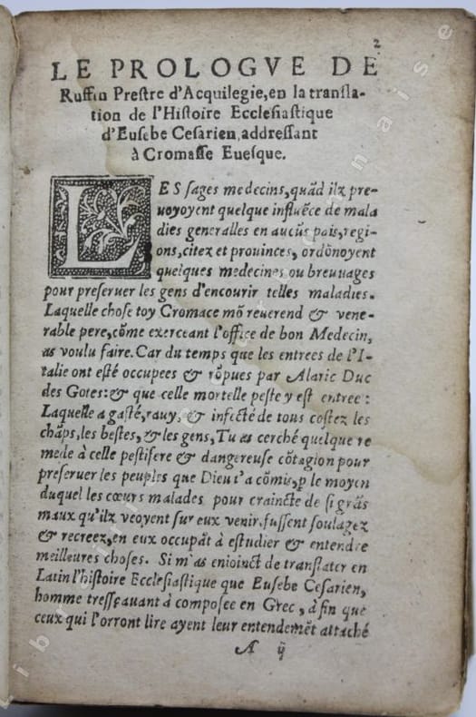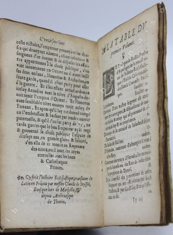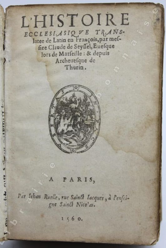 Le plus important ouvrage laissé par Eusèbe de Césarée, proche de l'empereur Constantin Ier qu'il soutient dans sa mission "divine". Son Histoire de l'Eglise chrétienne va des origines à la victoire de Constantin sur Licinius en 323, et constitue la première et principale source documentaire sur le sujet. L'ouvrage avait été traduit en latin par Rufin d'Aquilée à la fin du IVe siècle ; on lui doit aussi le prologue, des additions, des remaniements et la rédaction particulière des livres IX-X d'Eusèbe en un livre IX. C'est ce texte que Claude de Seyssel traduit en français ; il a été imprimé pour la première fois par Goefroy Tory à Bourges en 1532 (in-folio gothique). La BNF recense encore une édition à Paris en 1540 chez Gaultherot et une autre en 1553 chez L'Anglier, mais ne connaît pas notre exemplaire.