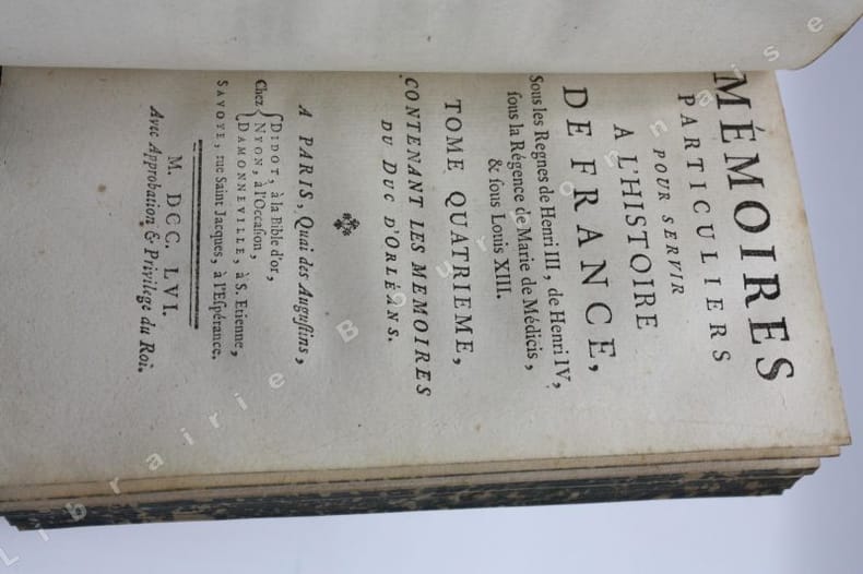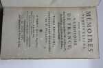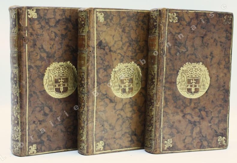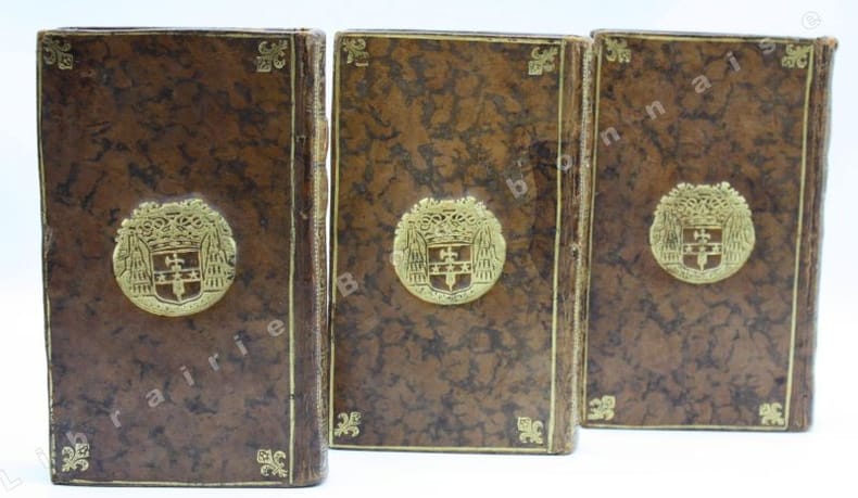 Paris, Didot, Nyon, Damonneville et Savoye, 1756 ; 4 tomes en 3 vol. in-12. 2 ff.- 389 pp-(3) pp. / 10 ff.- 332 pp. / 4 ff.- 270 pp. - 1 f. bl.-2 ff.- 227 pp. Veau brun marbré, dos lisses ornés, pièces de titre fauves, pièces de tomaison brunes, encadrement de simples filets dorés sur les plats avec fleur de lys aux coins et joli fer armorié sur les plats. Commentaires manuscrits anciens à propos de ces mémoires sur les premières gardes blanches. Bel exemplaire.