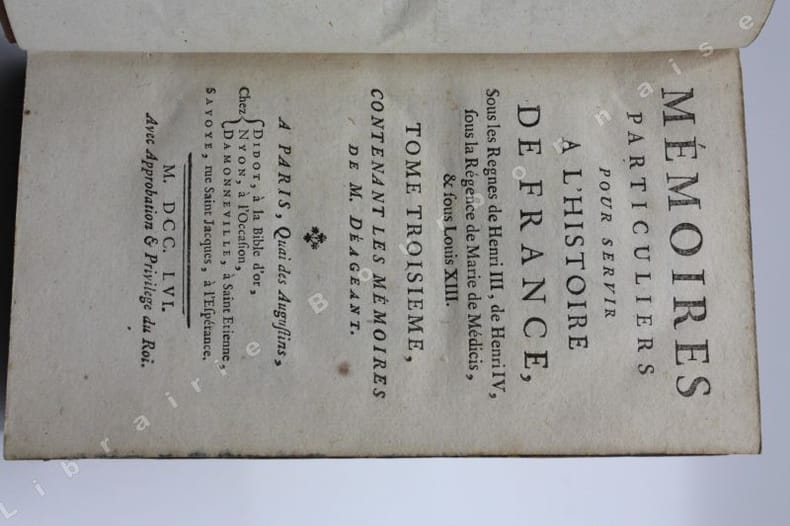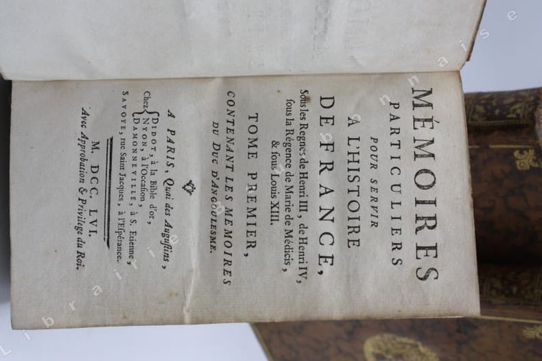 Aux armes du cardinal Mazarin, certainement imposées postérieurement. Chaque tome contient les mémoires particuliers, tout d'abord ceux de Charles duc d'Angoulême, fils de Charles IX et neveu d'Henri III, puis ceux de François-Annibal duc d'Estrées, qui avaient déjà parus 1668 qui renferment une relation du siège de Mantoue, de celui de Trêves ou encore du conclave qui vit l'élection du par Grégoire XV ; les mémoires de Claude Guichard Déageant lui aurait été demandées par Richelieu qui l'avait fait embastiller pour son implication dans la conspiration de Chalais ; ils ont paru dés 1668, "s'est un manifeste contre le Duc de Luynes, son bienfaiteur, et un panégyrique perpétuel de Richelieu son ennemi. Les mémoires manquent quelques fois de fidélité dans les faits et presque toujours dans le style, mais il y a des choses curieuses". Les Mémoires du duc d'Orléans ont été rédigés par Etienne d'Algay de Martignac, proche du duc, "bien instruit et excellent guide pour cette partie de l'histoire depuis 1608 jusqu'en 1636" ; ils avaient déjà paru en 1683.