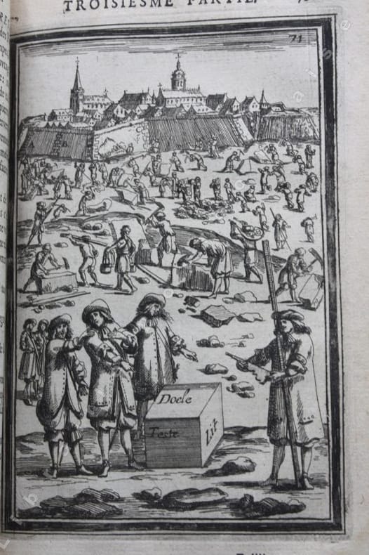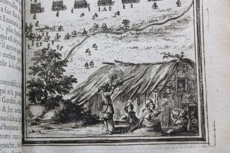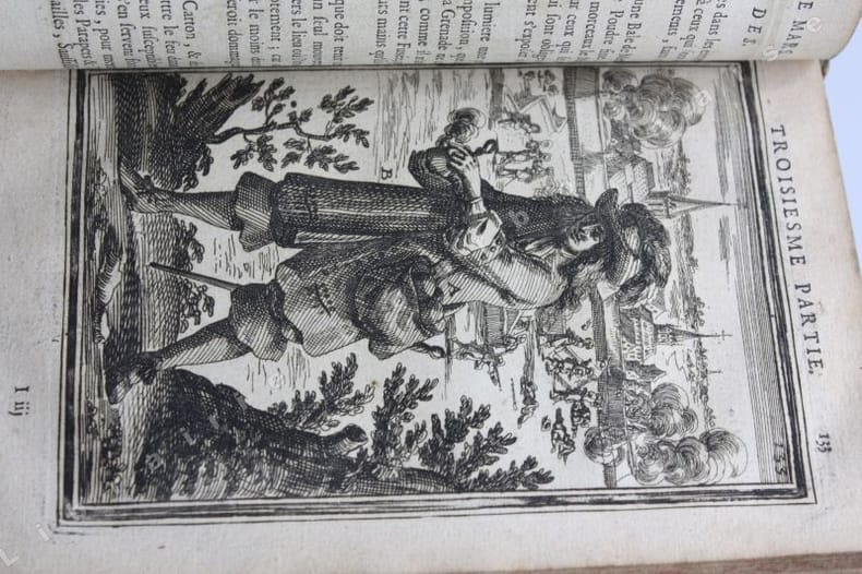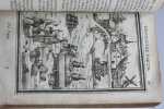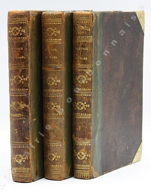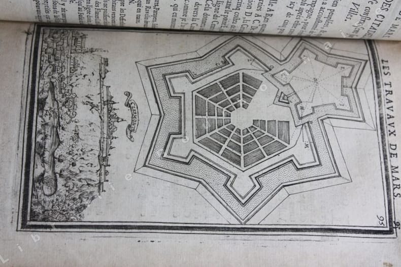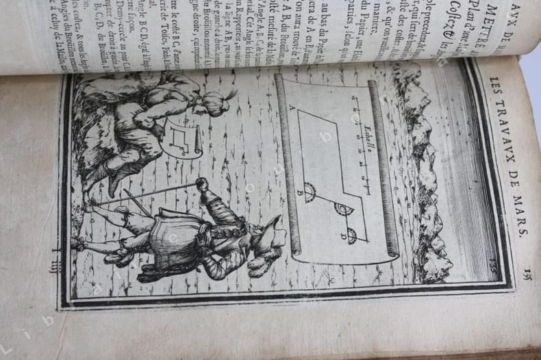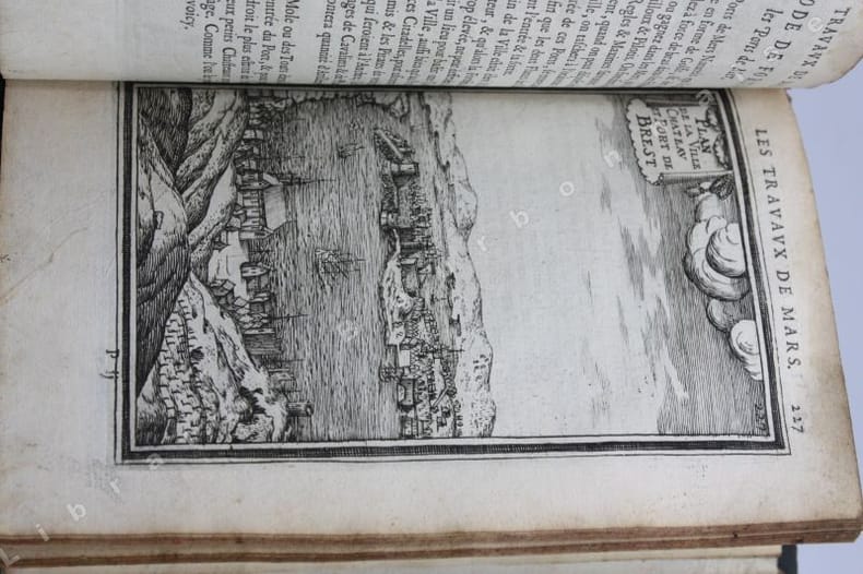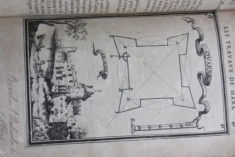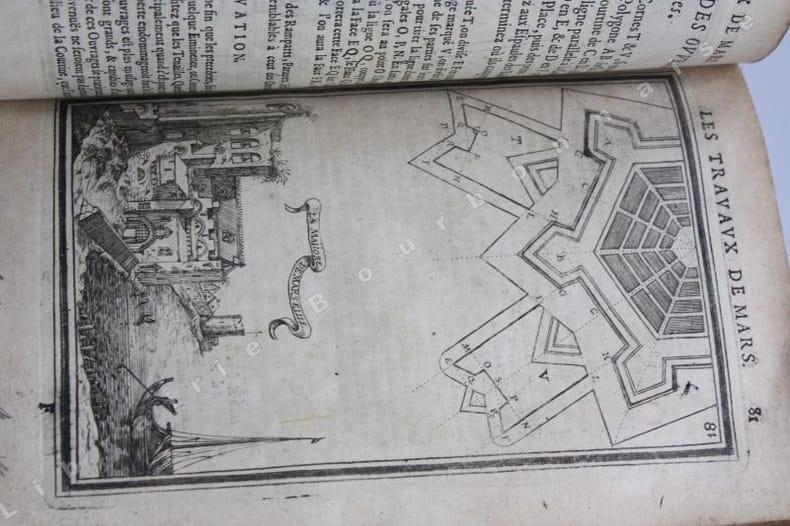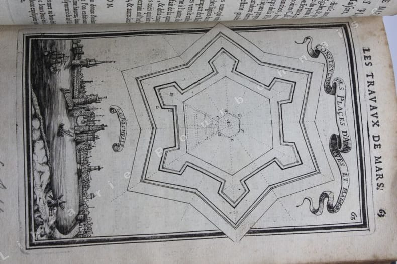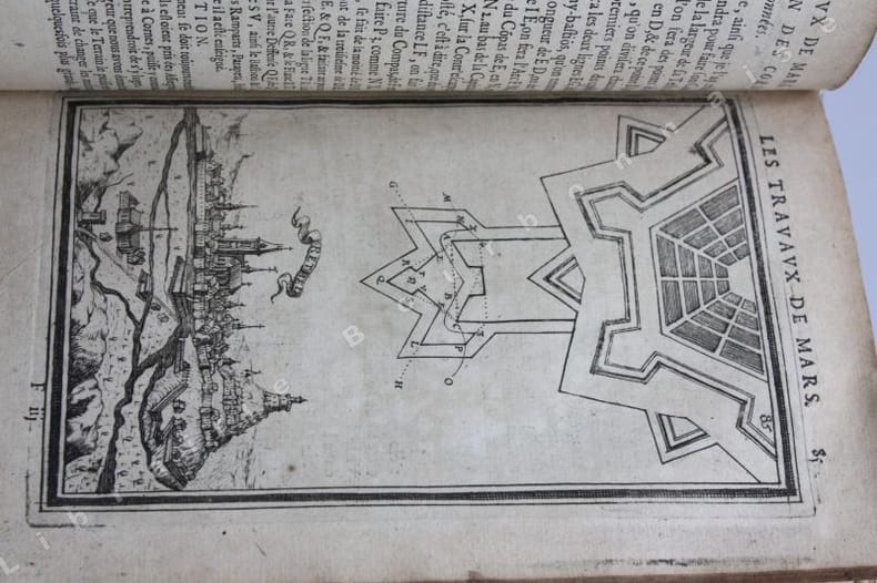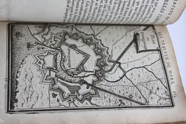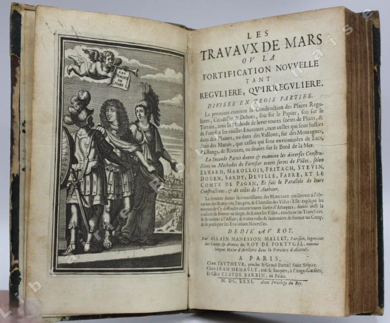 Paris Chez Iean Henault, . Et chez Claude Barbin 1671 in-8 plein vélin un volume, reliure janséniste d'époque en plein vélin ivoire parcheminé à rabats in-octavo (jansenist's binding full vellum in-8) (22 x 12,2 cm), dos long (spine without raised band), titre manuscrit à l'encre brune en haut du dos (handwritten title on the spine), plats muets (cover without text) avec manque de vélin sur la coupe (en bordure droite du premier plat), toutes tranches lisses (smooth edges) vieux rose, ex-libris (book-plate) : Dans un caisson (forme accolade par le bas), on trouve entrelacées les sept lettres suivantes (A. C. E. I. M. R. V.) en caractère Romain allongé que d'après la manière employée généralement, nous rangeons dans leur ordre alphabétique. Au-dessus, touchant les coins supérieurs de l'écusson, se voit une banderolle sur les replis de laquelle on lit la devise suivante: "Nunc nox mox lux" (Maintenant, la nuit, et bientôt la lumière) Cette marque a été faite de nos jours avec une espèce de cachet imprégné d'encre grasse tantôt bleue, tantôt verte, Texte en français, orné d'un titre frontispice gravé sur bois en noir :("Les travaux de Mars". Le frontispice représente Louis XIV entre Mars et Junon) + 106 gravures hors-texte gravées sur bois en noir, trace de mouillure claire d'époque en marge sur les premières pages, [(20) + 247 + 3 p. de tables] pages dont 106 cartes, M.DC.LXXI (1671) A Paris Chez l'autheur, proche le grand portail Saint Sulpice. Chez Iean Henault, rue S. Iacques à l'Ange Gardien. Et chez Claude Barbin, au Palais. . Avec privilege du Roy Editeurs,