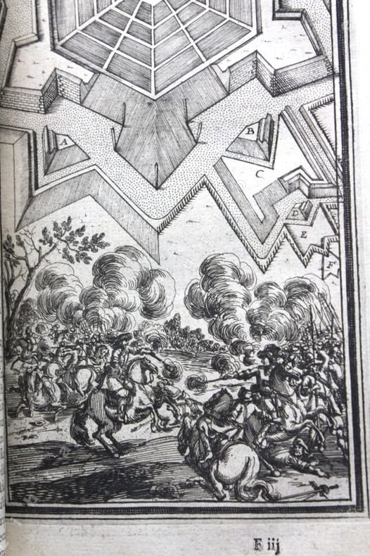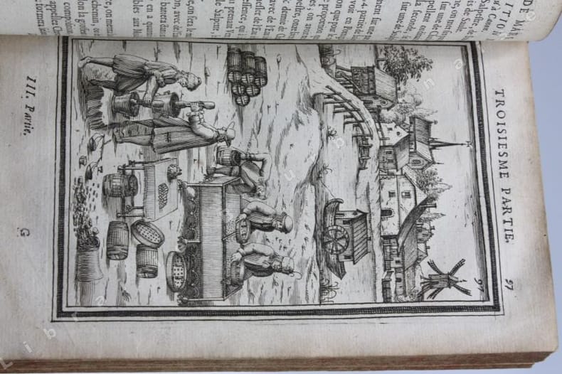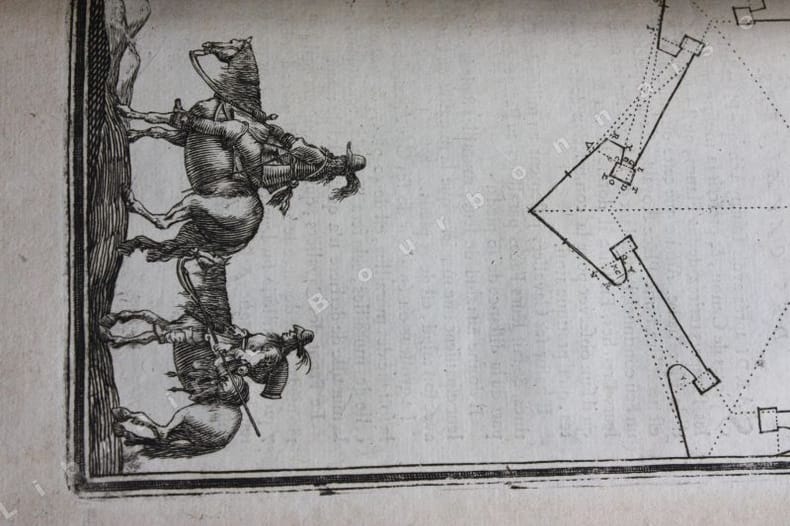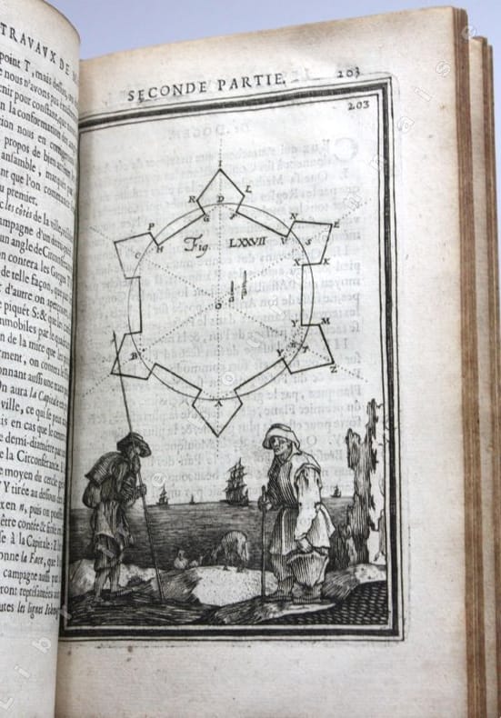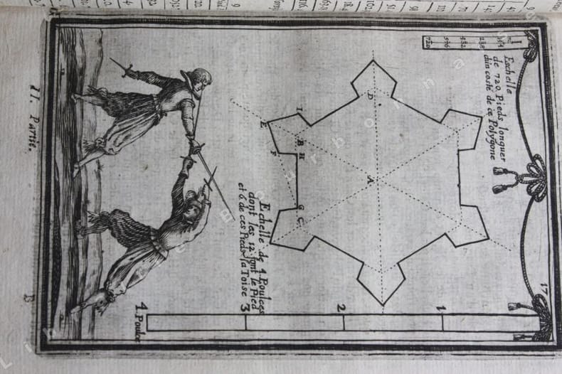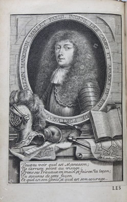 Edition originale ornée de 307 gravures pleine pages in-texte dont les frontispices et les portraits répétés sur chaque volume ; certaines planches également répétées. Elles sont presque toutes animées de personnages ou de scènes de genre (baignade, bergers, pêche, duel, danses...). Les plans de fortifications sont généralement accompagnés de vues villes qui ne sont presque jamais en rapport avec le plan figuré au-dessus, sauf dans le Second traité du tome 1 qui porte sur les fortifications irrégulières des villes. En plus d'être un ouvrage utile aux architectes traitant de l'art d'aménager, d'assiéger et de défendre les places fortes, il est un inventaire des fortifications tant en France que dans les pays environnants, avec un soucis artistique évident comme le montrent toutes les scènes qui enluminent chaque planche. Manesson Mallet écrira même dans la seconde édition de son traité en 1684 que les vues de villes quil a placées au bas de chaque planche "ont été gravées pour faire naître à la jeune noblesse le désir dapprendre à dessiner, dautant que dans la fortification, le dessin nest pas seulement une bienséance cavalière mais encore une nécessité absolue" (seconde édition, t. II, p.8)._Ce manuel de poliorcétique fut reconnu en son temps, et après, pour la science clairement expliquée par l'auteur et pour la modernité du fonds et de la forme de son ouvrage (même s'il n'évoque à aucun moment la travail de Vauban, ce qu'il rectifiera dans l'édition de 1684). Il consacre la troisième partie entièrement à la manière de faire la guerre : la composition des poudres, les feux d'artifice, les instruments d'attaque et de défense (canons, grenades, chevaux de frises, les mines, les contre-mines...), la manière de menée la troupe, de faire un campement... On voit par-là que Manesson Mallet était un ingénieur militaire très érudit, également cartographe et géographe il publia en 1683 une "Description de l'Univers" illustrée de 681 planches (Paris Denys Thierry, 5 vol. in-4) et encore une "Géométrie pratique" à Paris, chez Anisson en 1702. (Émilie d'ORGEIX, "Alain Manesson Mallet (1630-1706) - Portrait d'un ingénieur militaire dans le sillage de Vauban", Bulletin du Comité français de cartographie, n°195, mars 2008).