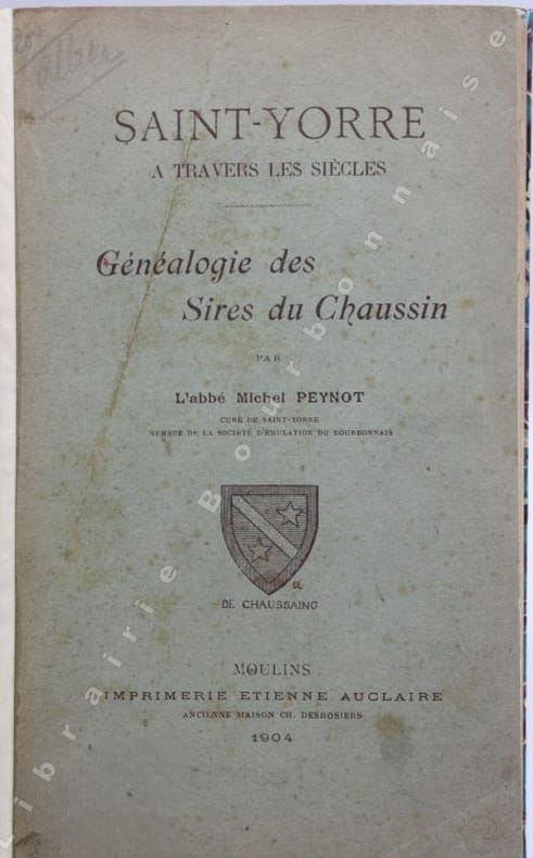 Monographie de l'histoire de Saint-Yorre, son église, le clergé, les habitants, les industries, avec une partie toute entière consacrée à la généalogie des seigneurs du Chaussin (1330-1850). Rare.