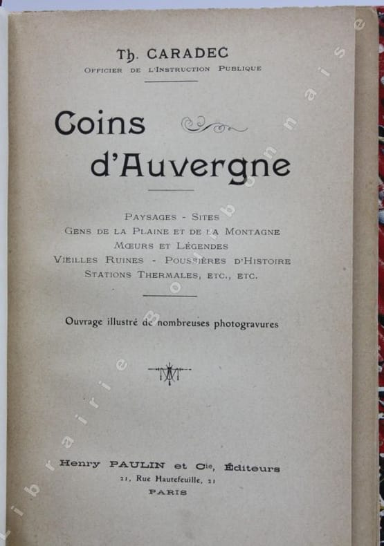Théophile Caradec (1851-1927) est né à Brest où il fit ses études de médecine à l'Ecole navale ; il fut par la suite affecté à Toulon puis à Brest et embarqué sur divers navires. En 1882 il se fixe à Brest comme médecin libéral et publie de nombreux articles sur des questions médicales, mais se fait surtout reconnaître auprès des plus déshérités qu'il soigne gratuitement. Il avait aussi une âme de poète voyageur et écrira sur sa Bretagne natale et au moins trois recueils d'impressions de voyage, "En Norvège", "De France en Russie" et ces "Coins d'Auvergne" où il retrouve la rudesse et la beauté de sa Bretagne. L'Auvergne qu'il parcourt ici est restreinte au département du Puy-de-Dôme et fait la part belle à Châteguyon, Châteauneuf-les-Bains, Clermont, le Puy de Dôme, Riom... Il s'intéresse aux paysage et à l'histoire mais aussi beaucoup aux moeurs et au folklore local.