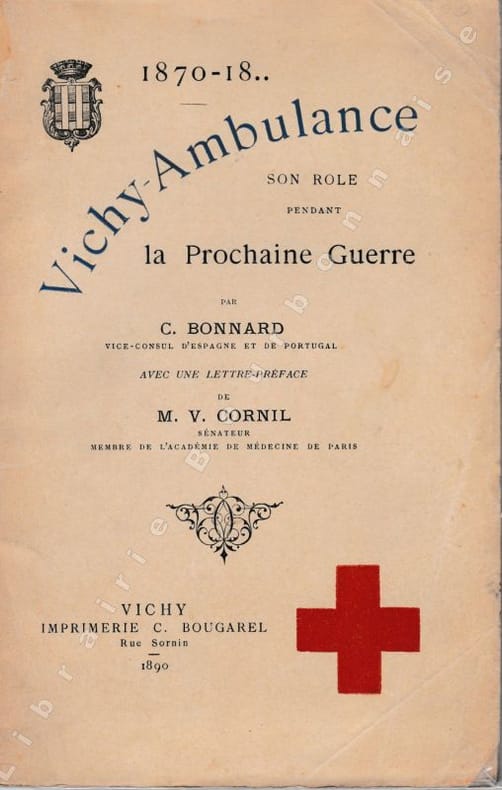 Edition originale. L'auteur s'intitule sur la couverture Vice-consul d'Espagne et de Portugal. L'ouvrage est précédé d'une lettre du médecin cussétois et sénateur de l'Allier Victor Cornil. A la suite l'expérience de la guerre franco-allemande de 1870, pendant laquelle Vichy servit d'accueil à de nombreux blessés, l'auteur analyse les atouts de la ville pour que soit envisagé d'y organiser le rassemblement des blessés de guerre lors d'un prochain conflit. Il donnera une seconde édition augmentée l'année suivante.