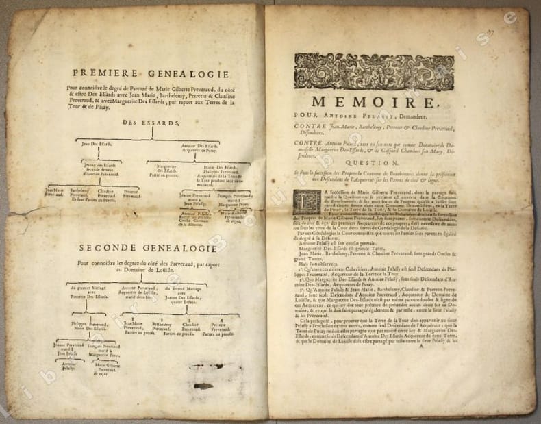 Factum pour un procès à propos de la succession de Marie Gilberte Préveraud concernant les terres de Putay (commune de Diou), de La Tour et du Domaine de Loüille (Le Donjon, Liernolles). Antoine Pelassy est le cousin germain de la défunte, les autres sont les grands oncles ou grands-tantes. Ces terres venaient d'Antoine Préveraud, seigneur de Coulon, de La Boutresse, de Laubepierre, des Plantais et de Morinot. Né au Donjon en 1618, il avait épousé successivement Pierrette des Essards (1636) puis Jeanne Desessards (1649). Il eut au moins 9 enfants vivants de ces deux unions. Antoine Pelassy était l'arrière-petit-fils d'Antoine, né en 1693 il est mort en 1743. La question de droit qui se pose est de savoir si les articles de la Coutume de Bourbonnais donnent la préférence, en matière de succession de propres, aux descendants directs de l'acquéreur ou aux parents en ligne collatérale.