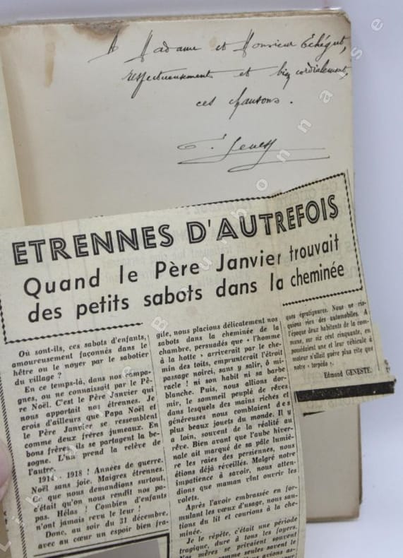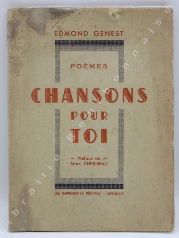 Edition originale avec un envoi autographe de l'auteur. On joint une coupure de presse parue dans La Montagne, contenant un court récit de l'auteur. Edmond Genest était originaire de Saint-Aubin le Monial1906-1983), tout près d'Ygrande ; il fut instituteur toute sa vie dans l'Allier et publia toute une série de recueils de poésies ainsi qu'un récit autobiographique "Jean Bruyère", en 1947.