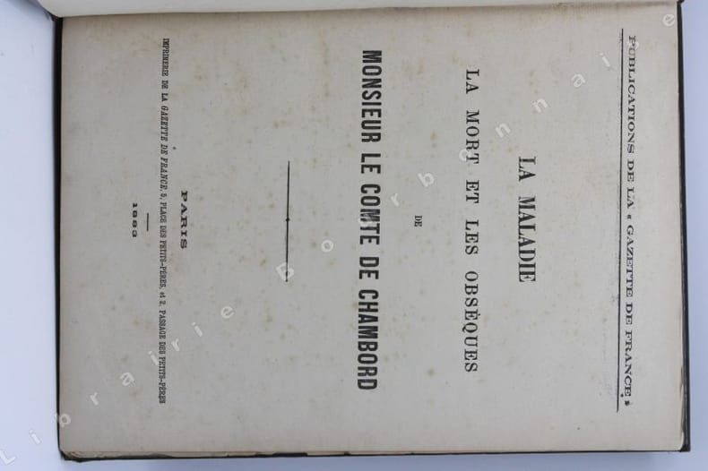 1883 Imprimerie de la Gazette de France, 1883 - Grand in 4 o -1 volume de 22.5 x 32.5 cm - Reliure pleine percaline noire avec titres en creux sur le premier plat, encadrement des plats d'un triple filet en creux, armes du comte dorées sur le premier plat en creux sur le dernier plat - accroc à un mors - petite tache à la page de préface - Ex-libris manuscrit "de La Messelière" - Texte sur 3 colonnes - 96 pages + Table des Matières - Comprend listes des personnes présntes à Frohsdorf, Goritz (Zouaves pontificaux) & à Saint-Germain l'Auxerrois - bon exemplaire - Réf. 46713