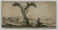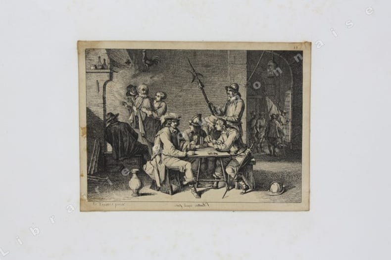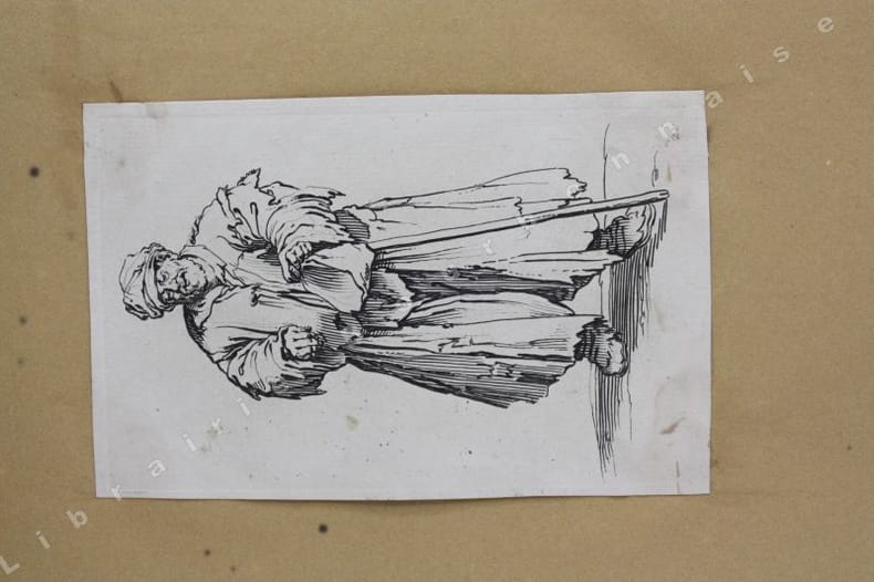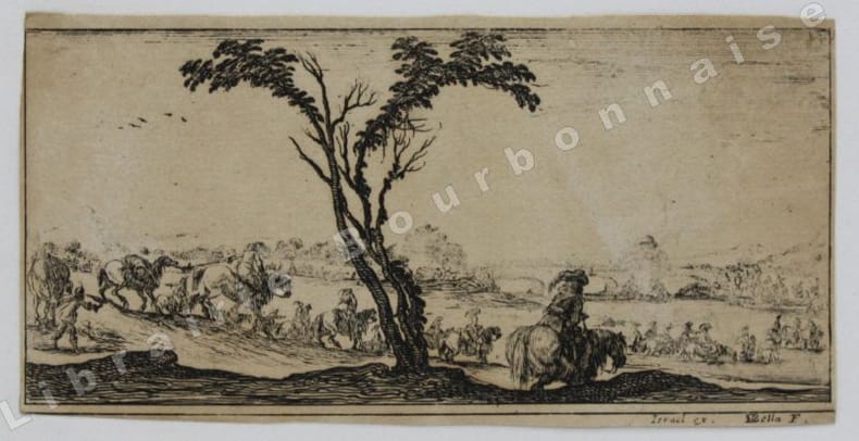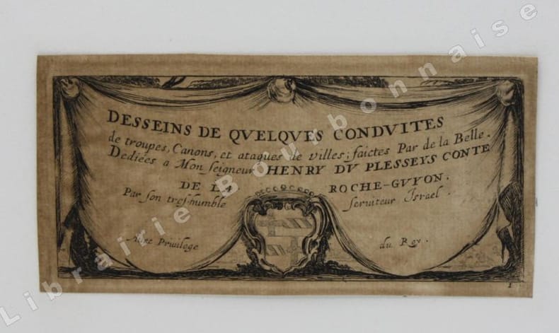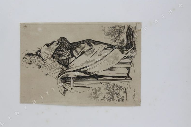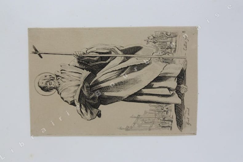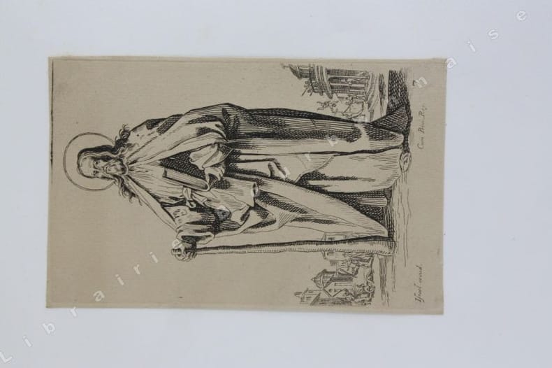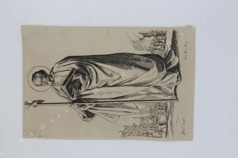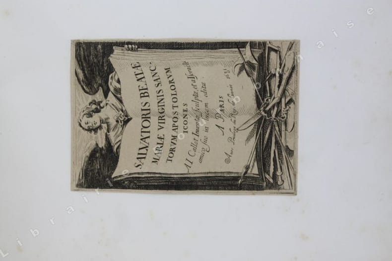 Comprend : Titre - Saint Pierre (Callot fec. - Israel excud. - 1) - Saint Paul (Callot fec. - Israel excudit - 2) - Saint André (Israel excud. cum privilegio regis - 3) - Saint Simon (Callot fec. - Israel excud.) - Saint Jacques le Majeur (Israel excud. Cum Privi. Reg. - 4) - Saint Jean (Callot fec. Israel excidit - 5) - Saint Thomas (Israel excud. Cum privi. Reg. - 6) - Saint Jacques le Mineur (Isrel excud. Cum Privi. Reg. - 7) - Saint Philippe (Israel excud. Callot fec. - 8) - Vierge Marie (Israel excud., Cum Privi. Reg.) - Saint Mathias (Israel excud. Callot Fec. - 10) - Saint Simon (Callot fec., Israel excud) - Saint Mathieu (Israel excud, Cum Privi. Regis) - Saint Thaddée (13-Israel excud, cum. Privi. Reg.) - Christ Sauveur (Israel excund., Cum Regis) - Saint Barthélémy (Israel excud.Cum, Privi. Reg.).Réunit à la suite : "Desseins de quelques conduites de troupes, canon et attaques de villes ; faictes par de la Belle...par Israel". (1644). Titre et 5 planches. 2 planches d'après Téniers.2 petits portraits par Michal Plonski9 planches des costumes des seigneurs et des dames de Lorraine (sur une série de 12) par J. Callot4 planches de gueux et mendiants par Callot.2 portraits gravés : Jeanne Gray et Marie Stuart, d'après Vander Werf gravés par Landon Reynofla, d'après Maarten de Vos, fait et publié par Adriaen Collaert (vers 1580)Soit un ensemble de 42 eaux-fortes ou gravures en taille douce.