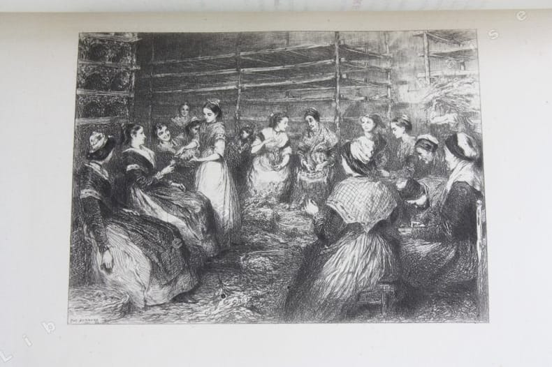 paris LIBRAIRIE HACHETTE ET Cie 1891 -in-8 PLEINE PERCALINE un volume, reliure pleine percaline ivoire cartonnage in-quarto Editeur à plaques spéciales polychromes (or, vert, et noir) pour le dos et les plats (editor hard-back grey percale with specials covers editor for the spine and the cover in-octavo), dos lisse orné d'un décor de pampre (feuilles de vignes vertes et grappes dorées), plat supérieur titré en lettres dorées et orné d'un décor de rameaux d'olivier aux feuilles vertes (signé A. Souze), tête lisse dorées, gouttière et tranche de queue non_rognées, Edition bilingue, texte provençal et traduction française, avec un feuillet de musique notée: Magali, mélodie provençale populaire transcrite par Fr. Seguin, Edition ornée d'un Portrait gravé de Frédéric Mistral en frontispice en noir + 24 eaux-fortes hors-texte en noirsous serpentes légendées, dont 21 sont reproduites par le procédé de MM. Lumière d'après les planches dessinées et gravées par Eugène Burnand et 55 dessins du même artiste tirés avec le texte en noir, 376 pages, 1891 à Paris LIBRAIRIE HACHETTE ET Cie Editeur,