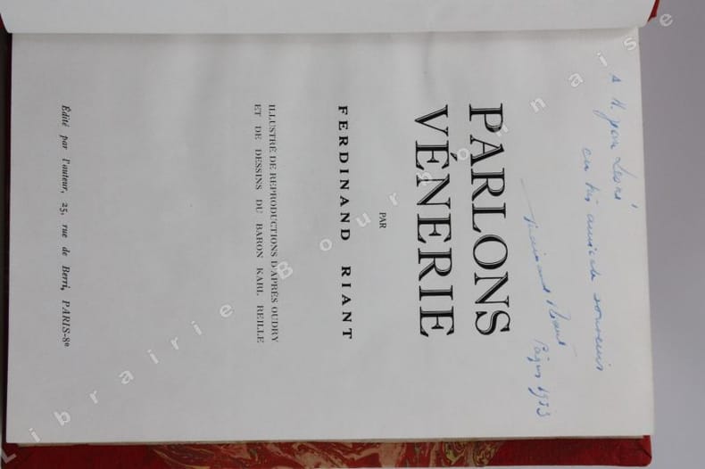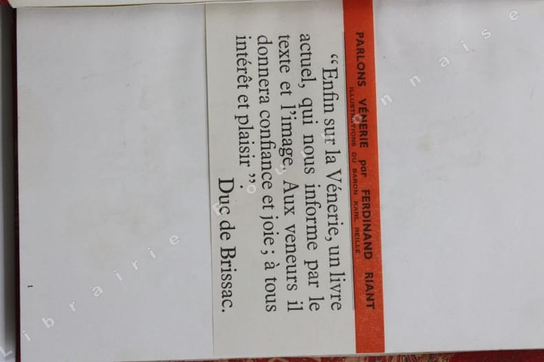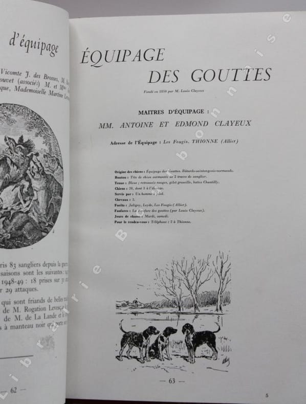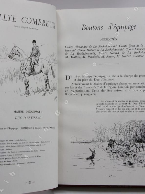 Edition originale tirée à 1700 exemplaires, illustrée de dessins in-texte en noir de Karl Reille, et de 16 reproductions de dessins d'Oudry (tirés d'une suite gravée vers 1760 par Wexelberg. 1 des 1200 exemplaires non numérotés, mais enrichi ici d'un envoi autographe de l'auteur. (Thiébaud-Mouchon 1237). Ferdinand Riant (1899-1983) est le petit-fils de Théodore Riant et neveu de Ferdinand Riant (1827-1897), ingénieurs et industriels, propriétaires en Bourbonnais des mines de Fins et de Noyant, également du château de La Salle à Vieure, de La Chaussière... où il tenait un équipage de ce nom. Dans cet ouvrage il donne tout dabord la description de 77 équipages de grande vénerie puis un tableau d'autres équipages qualifiés de "petite vénerie". On trouve à la suite un répertoire des termes et expressions de vénerie et nombreuses autres considérations sur les tenues de chasse, les Trompes, les sonneurs, les veneurs, la production chevaline. En somme un parfait portrait de la vénerie en 1950.